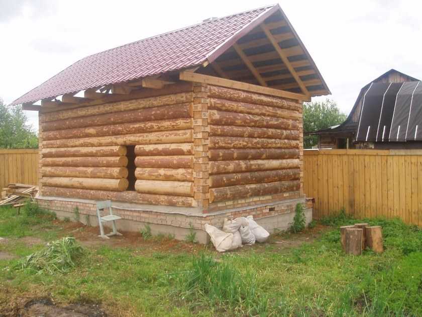 При возведении стен бани брусья укладываются друг на друга. Для теплоизоляции между ними прокладывается войлок. Чтобы нижние бревна не гнили и не разрушались, их кладут на широкую доску, обработанную антисептиком или пропитанную слоем битума. Высота стен должна быть достаточной, чтобы человек среднего роста мог комфортно расположиться внутри помещения. Слишком высокие стены делать нежелательно, поскольку, чем больше объем бани, тем сложнее будет ее прогреть