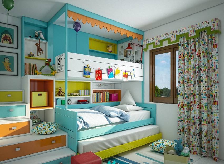 Зонирование маленькой детской часто проводят по вертикали: кровать убирают под потолок, под ней можно поставить мебель для игр, учебы.