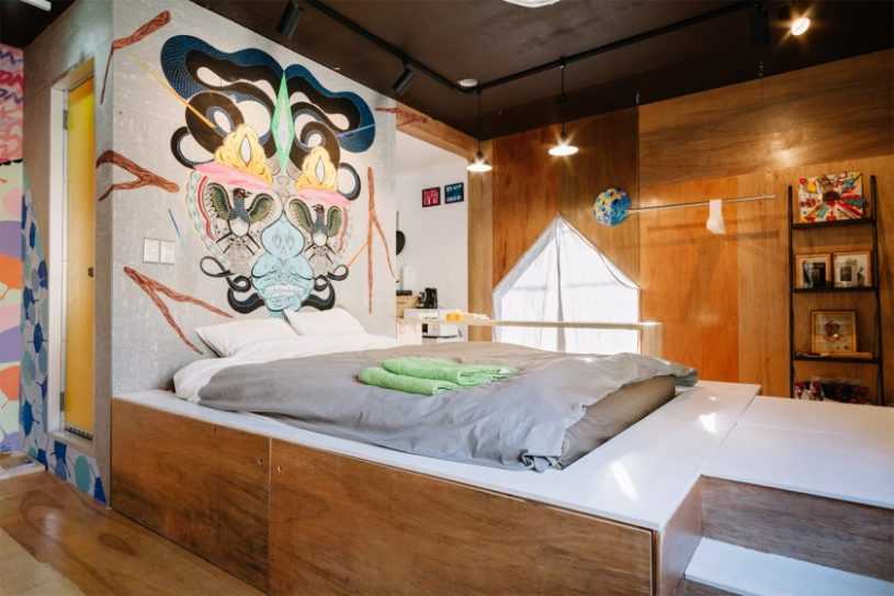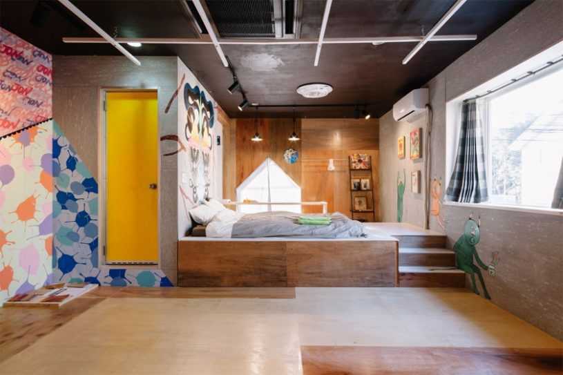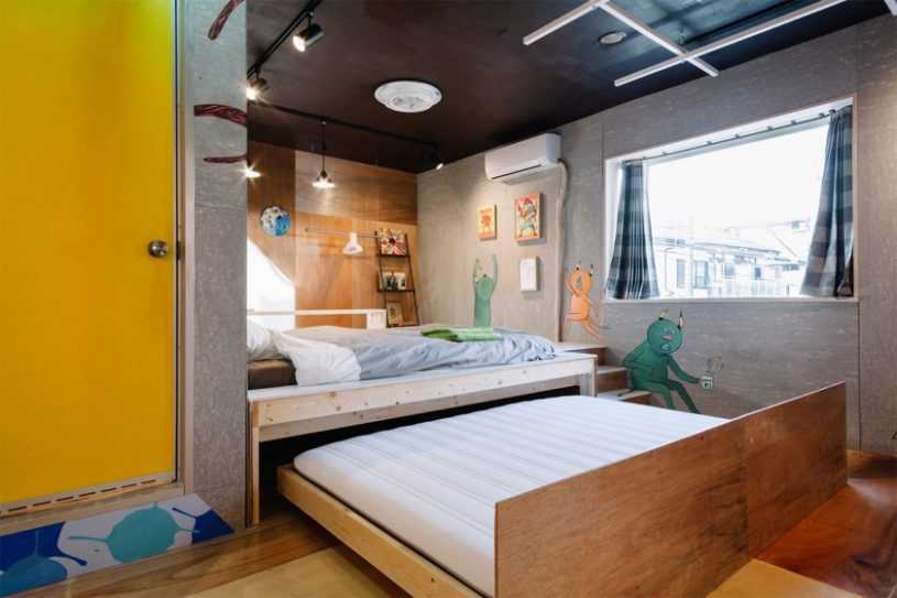 При таком решении настил должен быть достаточной высоты чтобы под него можно было спрятать кровать. Для такого решения идеально подходят длинные и узкие комнаты, которые еще называют вагончиками.