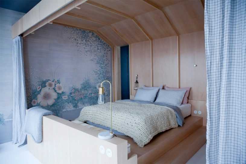 Даже возвышение в 15-20 см визуально отделит спальную зону. Для большей уединенности можно использовать балдахин или фальш-перегородки. Кстати, в подиуме можно предусмотреть и места для хранения – выдвижные ящики и полки.