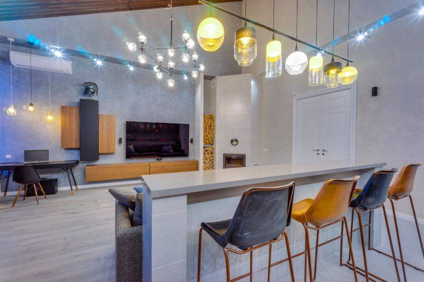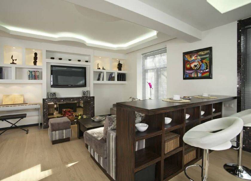 Использование многоуровневых потолков лишь визуально отделяет один сектор комнаты от другого. Понизив уровень поверхности над одной областью и подняв над второй, вы визуально получите две комнаты. Светодиодные светильники, установленные между перепадами высот, помогут выделить границу отрыва. Недостаток такого решения — уменьшение объема жилища.