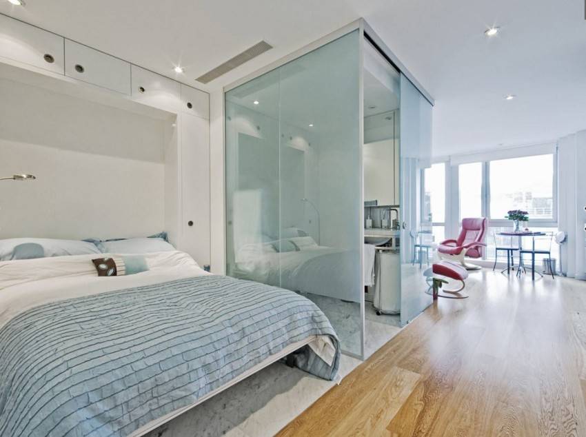 - Чтобы разделить маленькое пространство уместно использовать многофункциональные и складные мебельные предметы или выделить отдельную зону за счет акцентного цветового оформления. Для малогабаритной комнаты также применяют зеркальные или стеклянные перегородки, визуально расширяющие помещение и добавляющие ему воздушности.