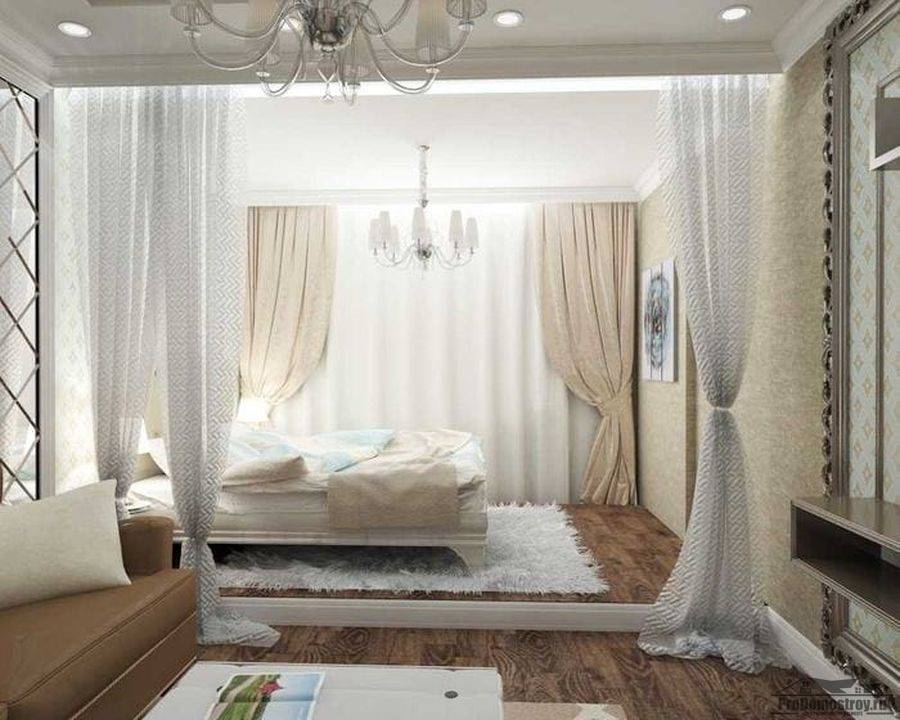 Даже возвышение в 15-20 см визуально отделит спальную зону. Для большей уединенности можно использовать балдахин или фальш-перегородки. Кстати, в подиуме можно предусмотреть и места для хранения – выдвижные ящики и полки.