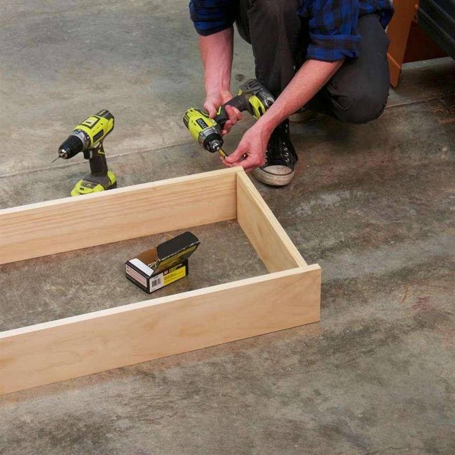 - Сборка каркаса с помощью конфирматов, по одному на каждый угол. Если высота превышает 15 см, то лучше использовать по два винта.