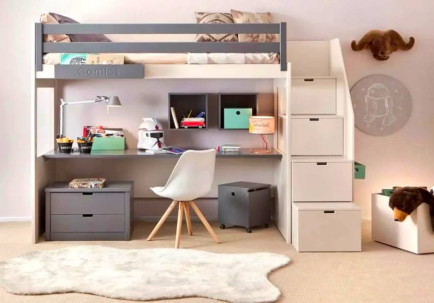 В небольшой детской проблематично разместить место для сна, письменный стол, игровую зону, тем более, если комната делится между несколькими детьми. В этом случае для подростков можно организовать верхнее спальное место, а на нижнем ярусе разместить младших. Как правило, дети с энтузиазмом воспринимают идею спать на высоте.