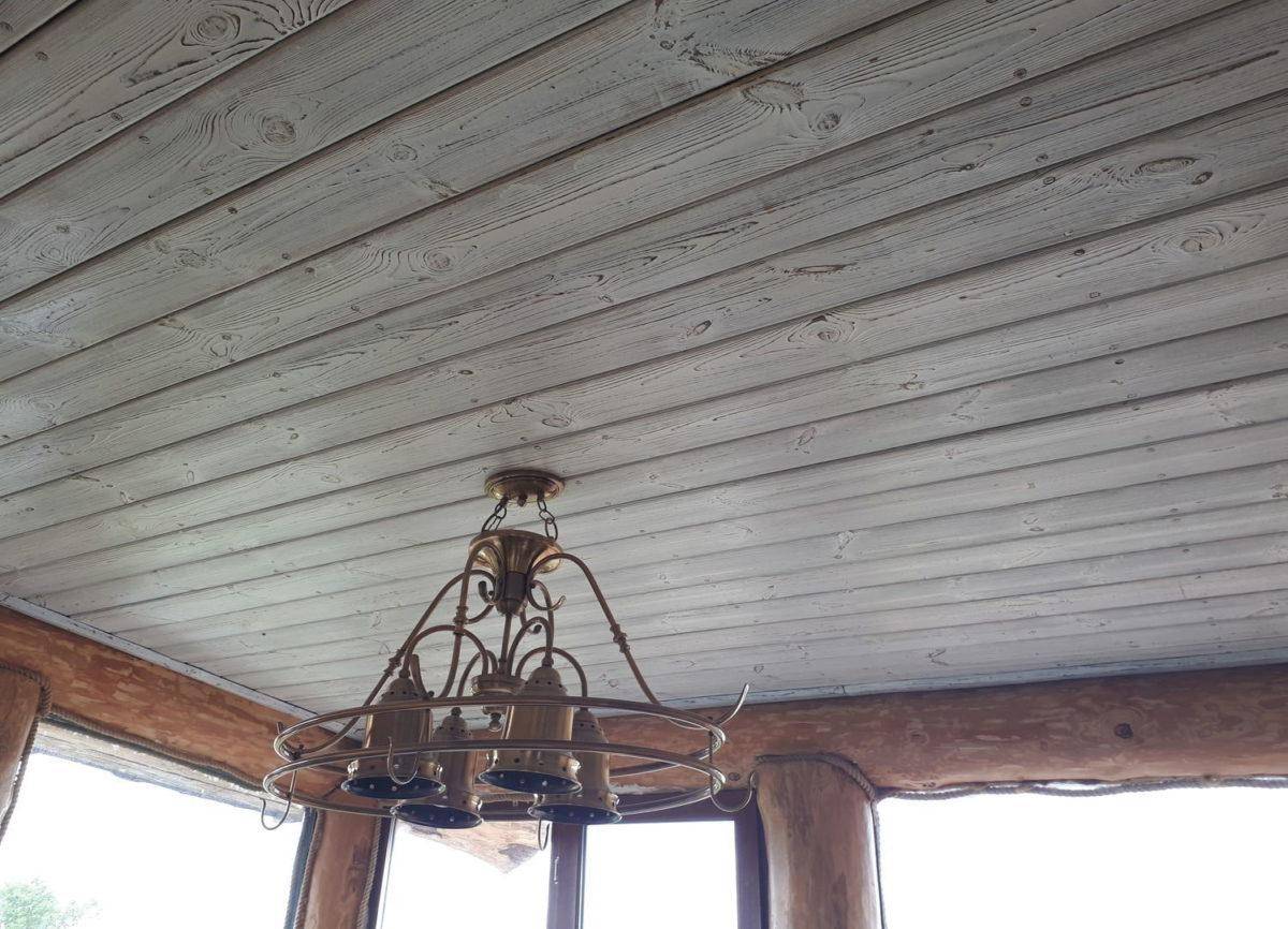 Потолок с белой вагонкой лучше всего смотрится, когда материал брашированный. Это можно сделать самостоятельно с помощью специального инструмента или купить готовый вариант.