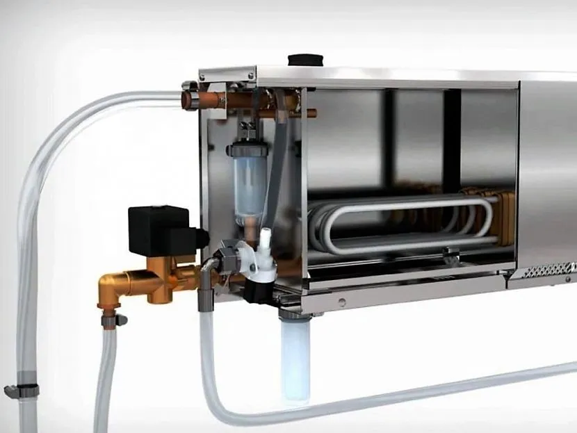 Предназначен для создания паровой сауны по типу турецкой или римской бани. Его дополнительная установка увеличит функционал домашней парной. Парообразователь подключается к водопроводной трубе и устанавливается не внутри, а снаружи сауны. Вода поступает в устройство, где она доводится до кипения. Пар передается в баню по трубам, выход которых располагается над верхними полками.