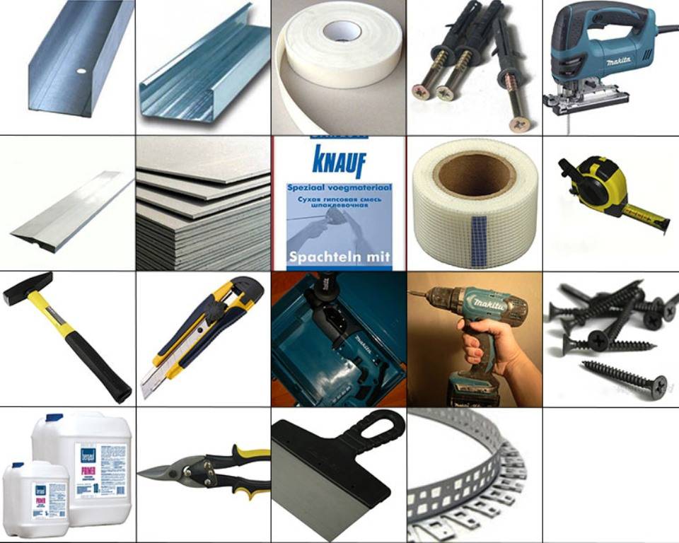 Помимо самих материалов, для возведения перегородок из гипсовых листов, будет необходим минимальный инструментарий.