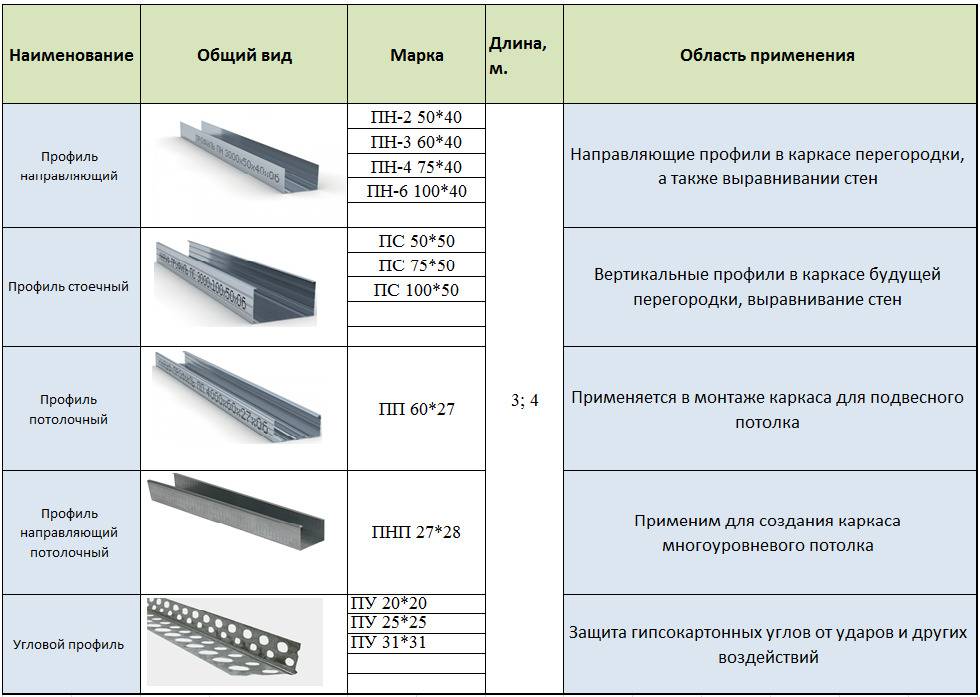 Для того чтобы стена была достаточно прочной, для нее возводят каркас из металлического профиля. Для разного назначения существуют и различные профили.