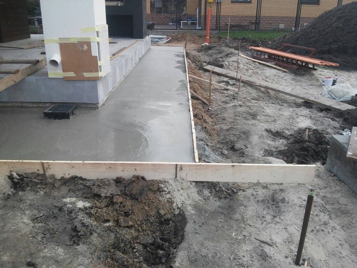 По краям готовой, высохшей отмостки, нужно вырыть траншею под трубу или водосточный желоб. Ее глубина около 15 см, а ширина 30 см.