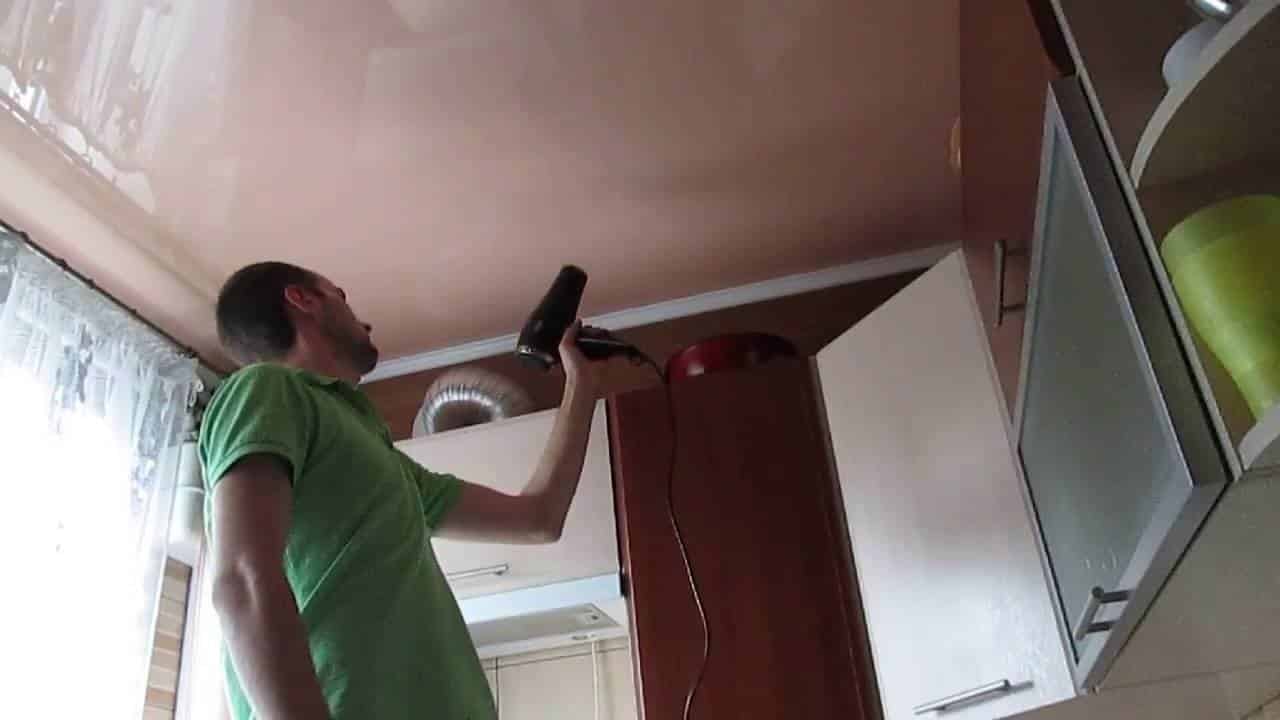Когда вода удалена, пространство под потолком тщательно просушивают. На месте, где была выпуклость с водой, полотно вытянулось и имеет не красивый вид. Чтобы это устранить пленку в этом месте прогревают феном до тех пор, пока она не натянется и примет первоначальный вид. После этого производят монтаж прибора освещения.