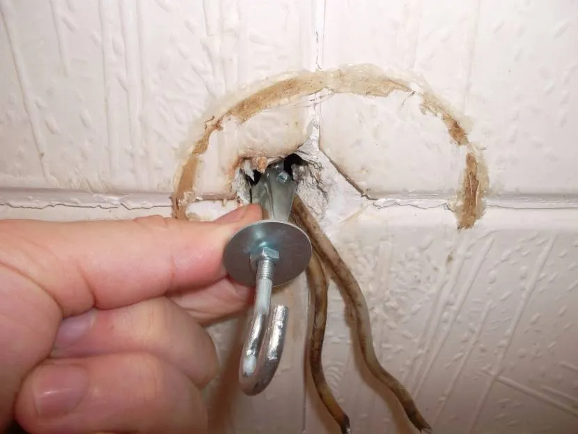 - Когда доступ к отверстию в полотне открыт, изделие аккуратно снимают с крюка и вытаскивают наружу вместе с подсоединенными элементами проводки.