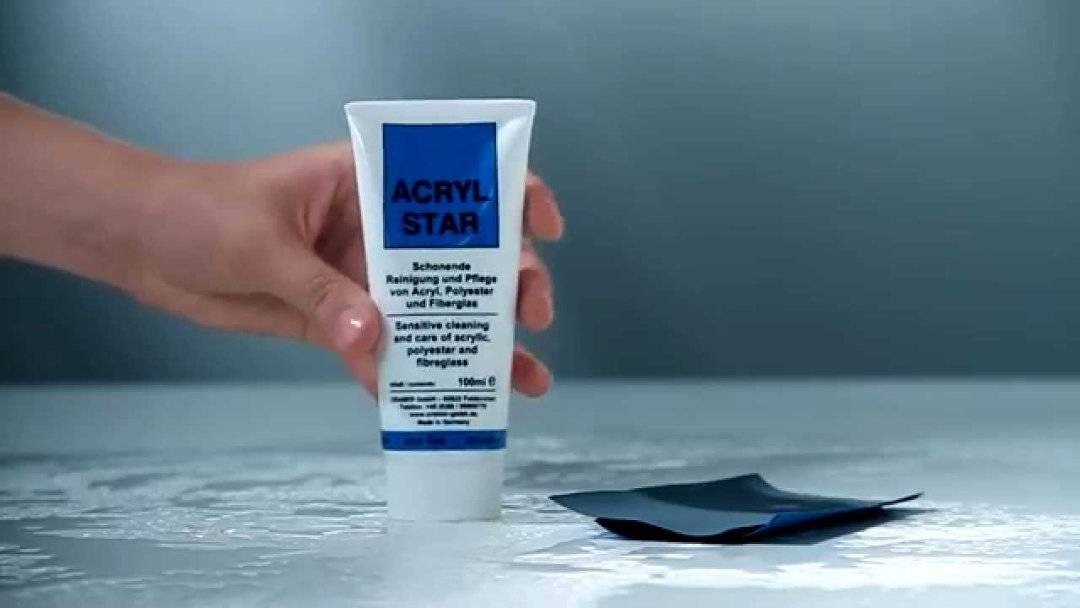 Специально подобранные вещества и полирующие компоненты в составе Acryl-Star от Cramer помогают восстанавливать цвет, устранять пятна и известковый налёт, при этом полируя поверхность ванны. Более глубокие царапины надо обрабатывать с помощью шлифовальной бумаги из комплекта, а потом довести соответствующий участок до зеркального блеска с помощью пасты.