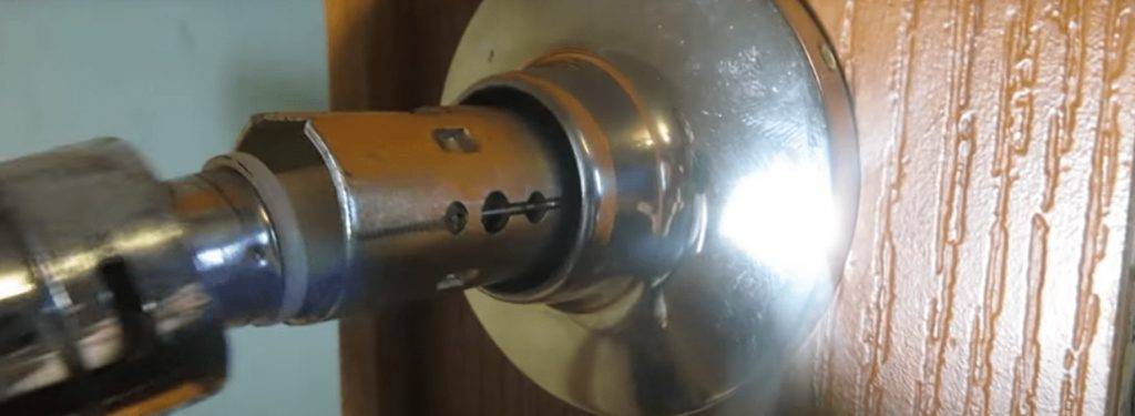 По сходному алгоритму осуществляется монтаж дверной ручки, совместно с которой установлен замок. Отличие двух процессов в высверливании большего по размеру торцевого посадочного отверстия и в обустройстве добавочного отверстия в боковой части двери для цилиндра замочной скважины. Остальные этапы осуществляются идентично вышеописанной схеме.