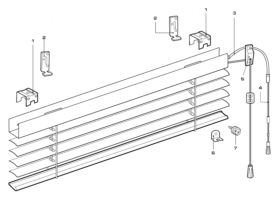 В стандартный комплект с жалюзи на пластиковые окна должны входить: 2 крепежных кронштейна, саморезы, профильный карниз, тканевые ламели с уже вставленными в них утяжелителями и соединяющая их снизу цепочка.