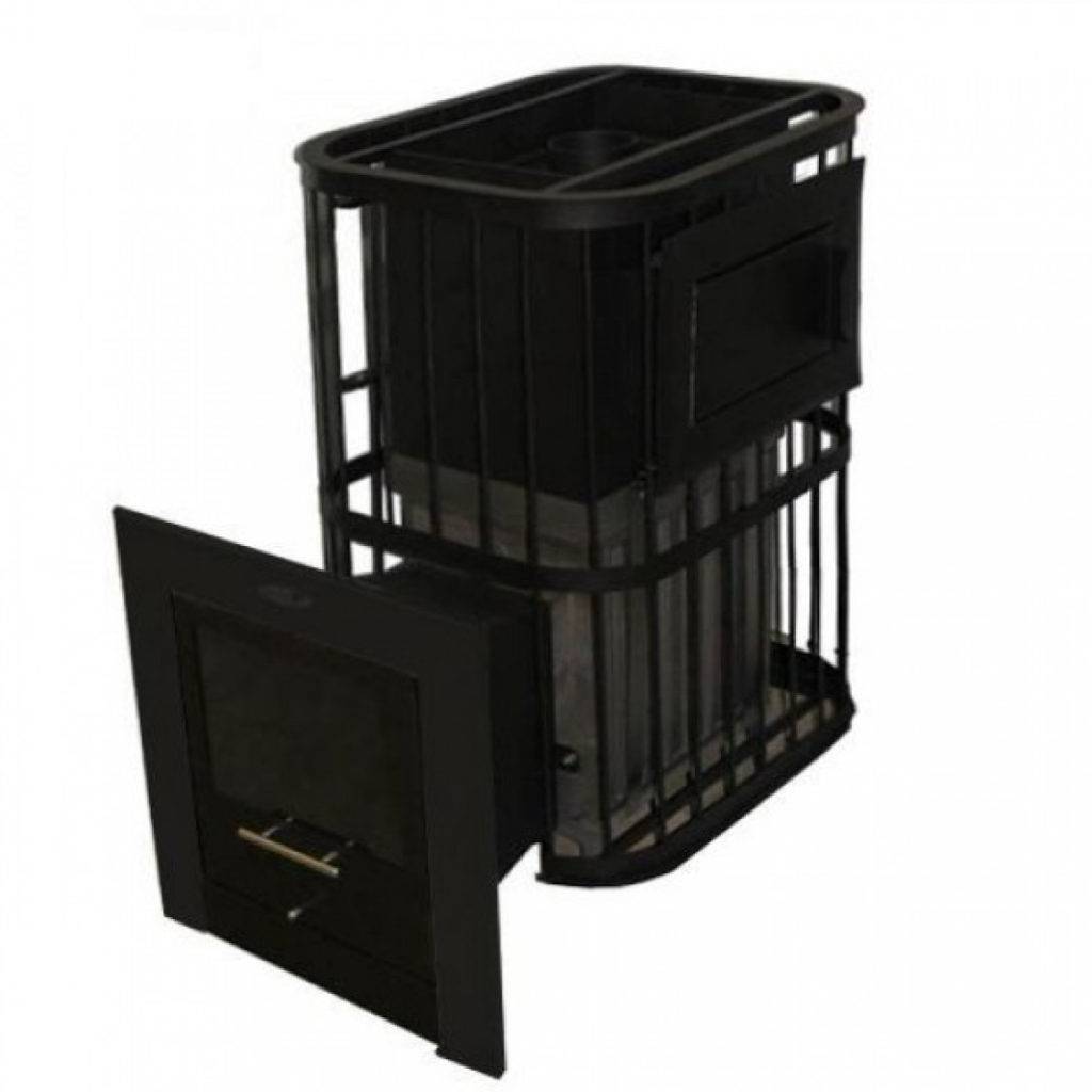 Конструкция дровяной печи детально продумана и направлена на максимальное удобство эксплуатации. Стальной корпус окрашен в черный цвет специальной краской. За счет чего копоть незаметна на печи, а устройство не теряет привлекательного внешнего вида даже после длительной эксплуатации. Топка прикрыта стеклянной дверцей, поэтому, находясь в сауне, можно не только наслаждаться ароматом дров, но и наблюдать за языками пламени. По желанию, пользователь может изменить сторону открытия дверцы, просто перевесив ее. Печь рассчитана максимум на 30 камней, но для небольшой сауны этого количества вполне достаточно.