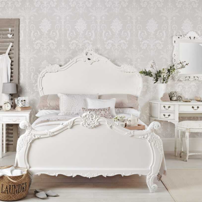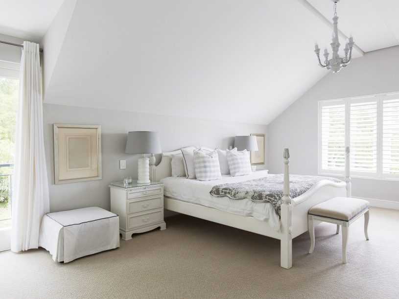В спальне самое большое пространство, как правило, занимает кровать: она обязательно должна быть в белых или тонированных светлых оттенках. Упрощенная формула дизайна примерно такова: спальное место меловых оттенков плюс прикроватные тумбы известкового тона и светло-серый ковер с длинным ворсом — белая спальня готова, даже если остальной интерьер (гораздо) темнее.