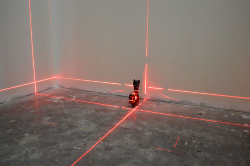 После включения нивелира на всех поверхностях в помещении появляются красные линии. Если направляющие выставлены неправильно, то становится заметно отклонение от ориентира. Большую ответственность берет на себя работник, направляющий агрегат при создании проекции плоскостей. Все манипуляции должны быть осуществлены правильно, в соответствии с инструкцией.