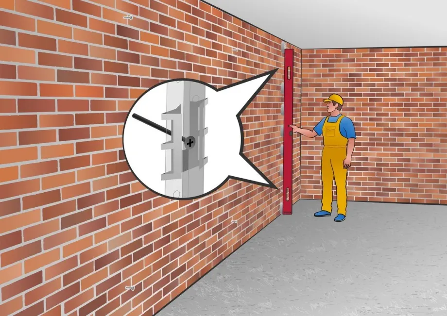 - На предварительно установленные саморезы к стенке (перпендикулярно, на ребро) приставляют планку правила.