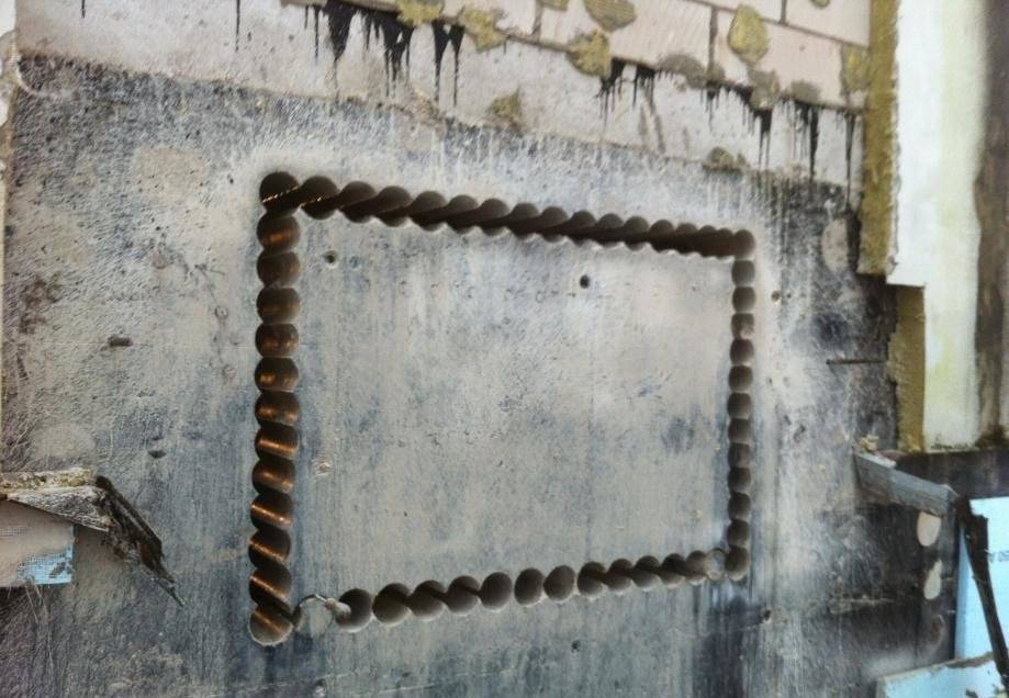 Резка стен начинается с верхнего элемента, прямоугольные элементы вырезаются и извлекаются последовательно друг за другом, пройдя не менее 2/3 размеченной площади, остальную часть можно выбить более грубыми методами.