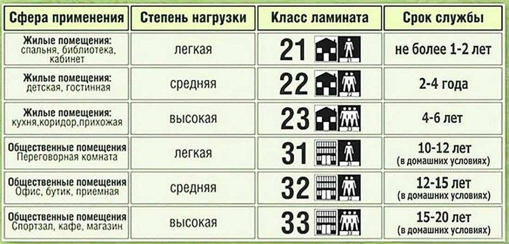 Предложенные классы – безупречный выбор для квартиры, поскольку они способны выдерживать как и статическую, так и динамическую нагрузку. А если еще и хорошо выровнять черновой пол и воспользоваться подложкой, то период эксплуатации покрытия увеличиться на несколько лет вперед.