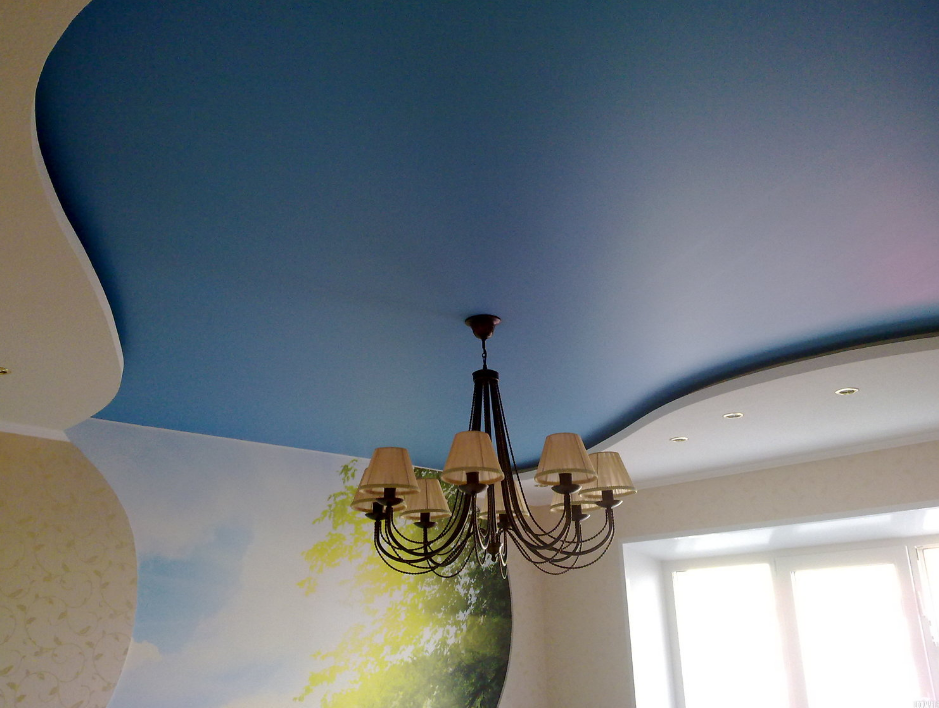 Пылеотталкивающая пропитка способствует долгому сохранению чистоты, а варианты расцветки значительно шире, чем у ПВХ-пленки. Можно использовать любые фотокомпозиции, пейзажи, произведения живописи. Хотите потолок, расписанный как Сикстинская капелла? Без проблем! А ширина исходного материала позволяет не делать стыков и швов даже в широких помещениях. Ннаконец, натяжной потолок из полиэстера – не такой дорогой, поэтому на матовом потолке можно сэкономить.