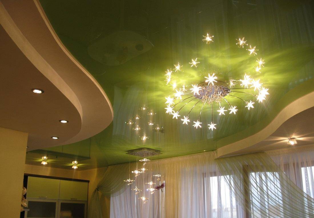 Ее светоотражающие свойства позволяют играть светотенью и при правильном освещении создавать просто сказочные интерьеры. Объемное отражение в такой плоскости визуально увеличивает не только высоту комнаты, но и площадь помещения. У дизайнеров такой прием называется эффект “зеркала” или эффект “второго этажа”. Темные полотна обладают более выраженным свойством отражать предметы – у потолка появляется глубина, которая придает помещению ощущение нереальности. Благодаря богатому выбору цветов и оттенков комнаты получаются нарядными и стильными, а эффект от освещения удовлетворит самые изысканные вкусы. Используя светильники и люстры, создают неподражаемые потолочные композиции.