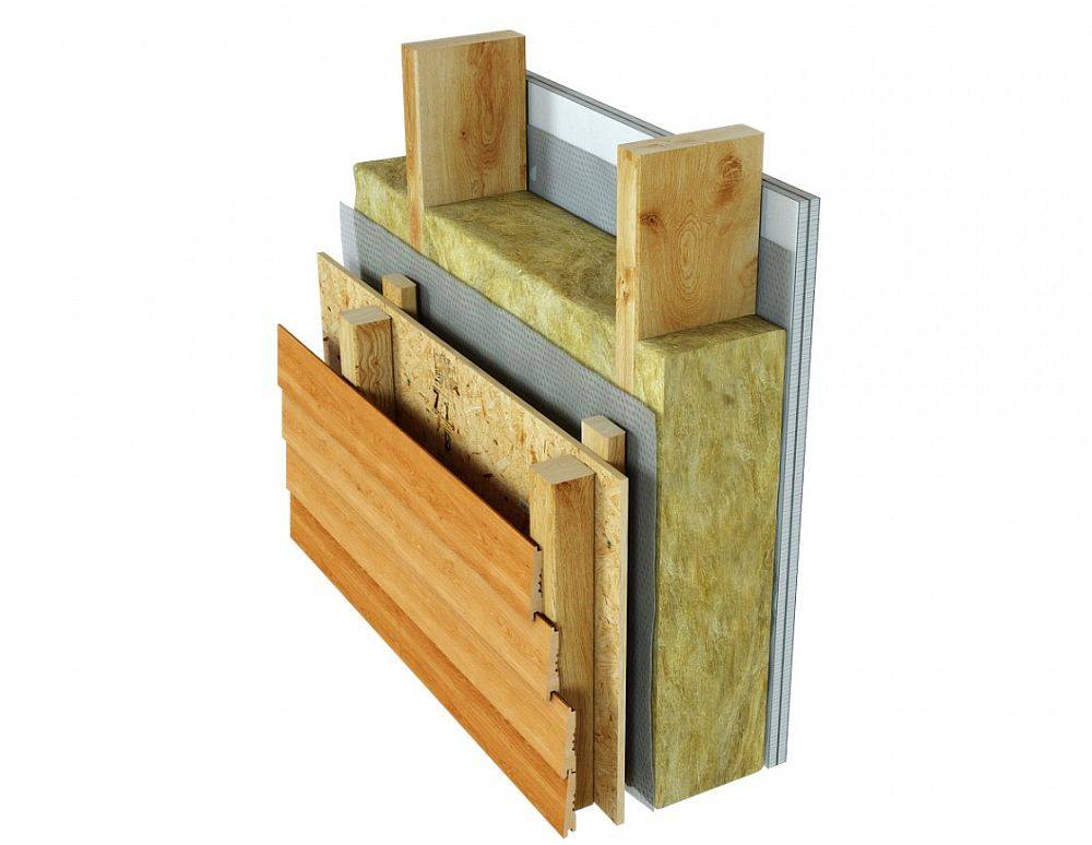 С внешней стороны поверх слоев утеплителя закрепляют плиты ОСП, на которые укрепляют пленки для ветровой и влагозащиты. ОСП усиливают жесткость конструкции. Между ветрозащитной пленкой и внешним отделочным материалом всегда оставляют вентиляционный зазор, в него выводят точку росы, регулируя слои утеплителя.