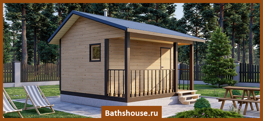 Каркасная баня может быть оборудована террасой для посиделок в теплое время года