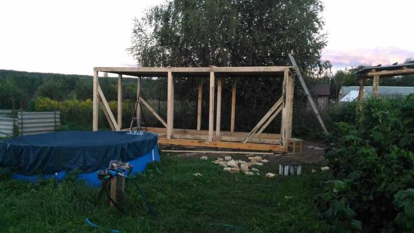 Затем стойки необходимо укрепить раскосами, как показано на схеме выше. Для изготовления раскосов используйте доски 150х40 мм. Торцы раскосов обрежьте под углом, которым они будут примыкать к обвязке и стойкам. Для фиксации досок воспользуйтесь саморезами и уголками.
