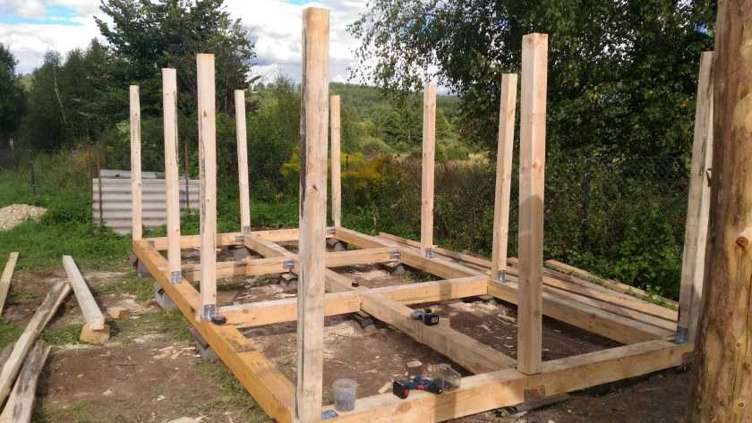 Далее установите промежуточные стойки стен с шагом 600 мм, выполненные из доски 150х40 мм. Для крепления стоек используйте стальные уголки, которые должны располагаться с двух сторон раскоса. Кроме того, соедините промежуточные стойки друг с другом, а также с угловыми стойками при помощи перемычек, выполненных из таких же досок. Перемычки располагайте в шахматном порядке, т.е. на разном уровне.