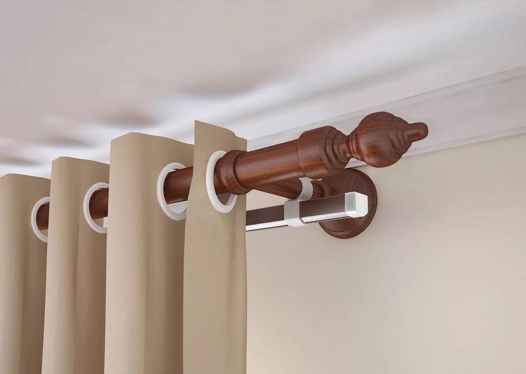 Обратите внимание! Беспроигрышным вариантом для любого интерьера станут конструкции белого, коричневого, бежевого и черного цвета. Как выбрать карниз для штор в залу с натяжными потолками? Здесь будут отлично смотреться комбинированные изделия из дерева и металла с пластиковыми либо кожаными вставками. С глянцевыми потолочными покрытиями хорошо сочетаются простые модели прямоугольного или круглого сечения, позволяющие избежать пестрого отражения на потолке