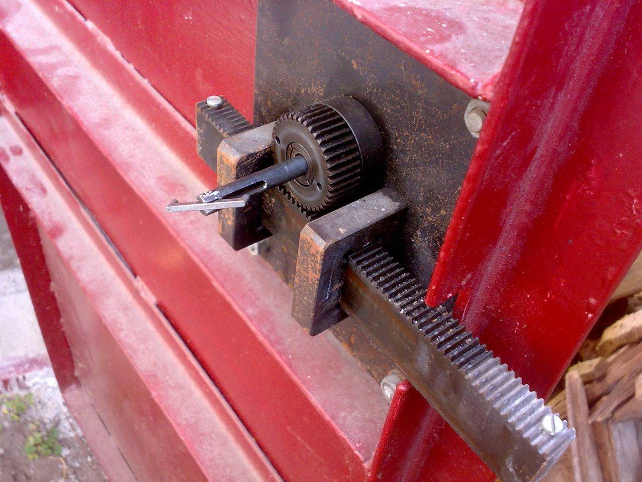 - Пазовый запор с поворотным механизмом. При довольно простой конструкции, этот механизм обладает высоким качеством и уровнем защиты от вскрытия замка. Однако, несмотря на невысокую сложность устройства, его самостоятельное изготовление требует довольно много опыта и соответствующего инструмента. Принцип работы механизма основывается на том, что ключ при входе в замочную скважину с помощью круговых движений задействует шестеренки механизма, который в свою очередь открывает либо закрывает ворота.