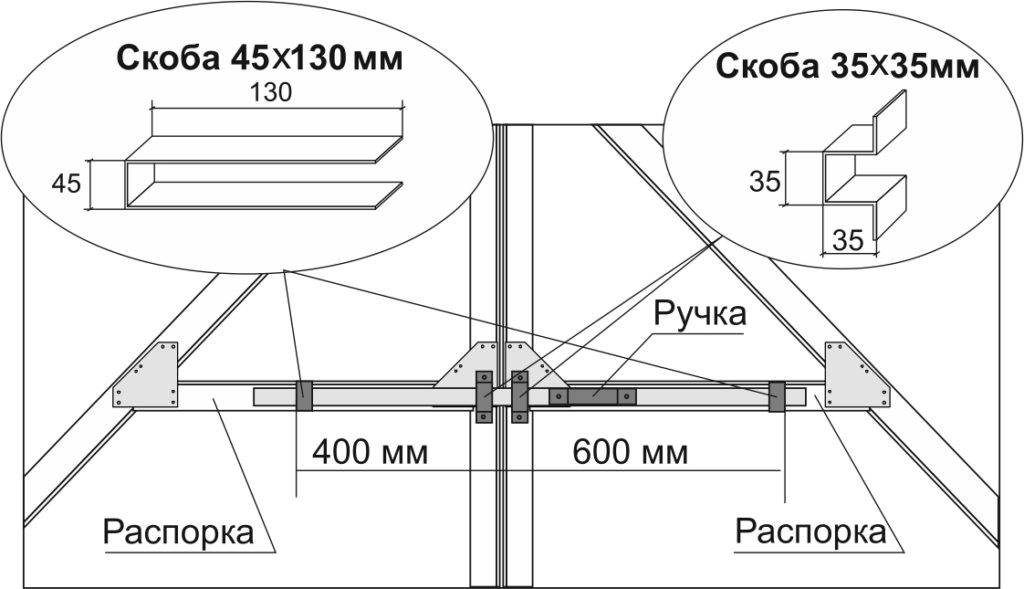 - в качестве запорного механизма для двустворчатых ворот может служить металлическая полоса (5 мм) или деревянный брус. Длина полосы или бруса – 2/3 ширины ворот;
