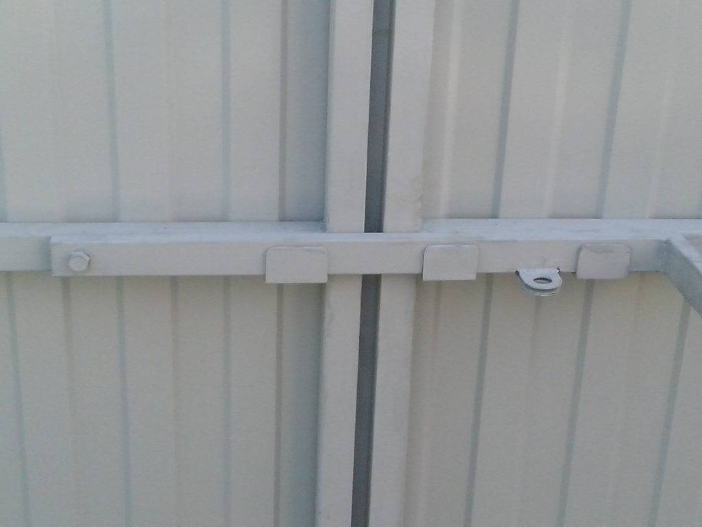 Минус такого запора – нет прочной фиксации, при сильном ветре створки ворот из профнастила перекручиваются. Поэтому лучше устанавливать три задвижки, фиксирующие створки, на расстоянии 50 см сверху и снизу и одну по центру ворот на ребре жесткости.