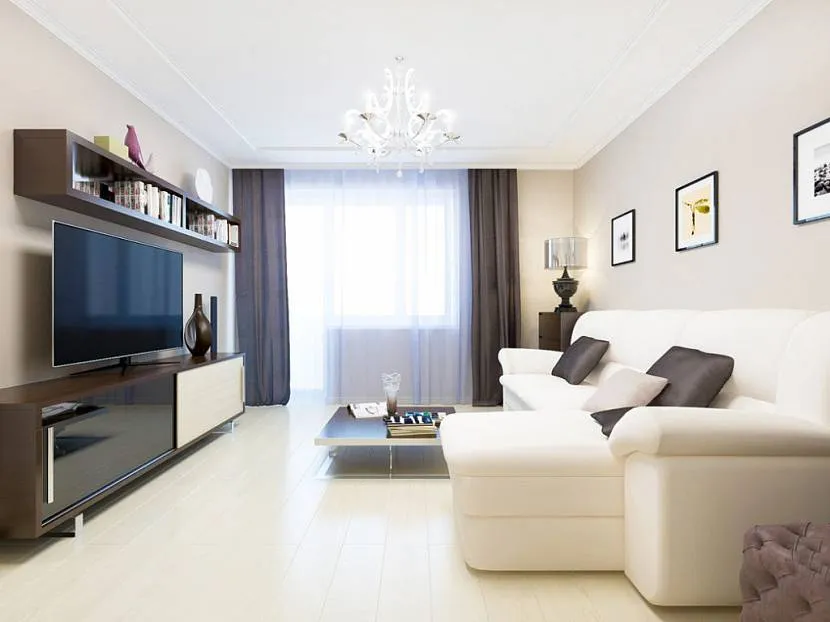 Белая гостиная с темными шторамиИсточник Дизайн интерьера квартиры