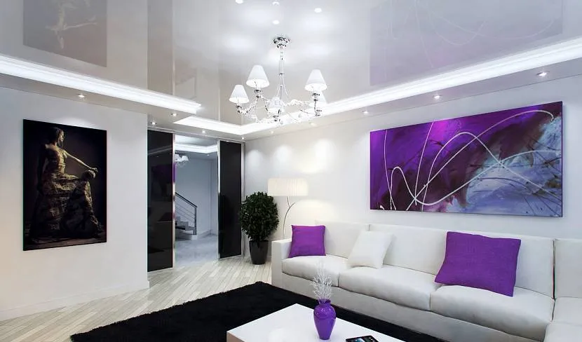 Черно-белая гостиная с большой люстройИсточник Ремонт без проблем
