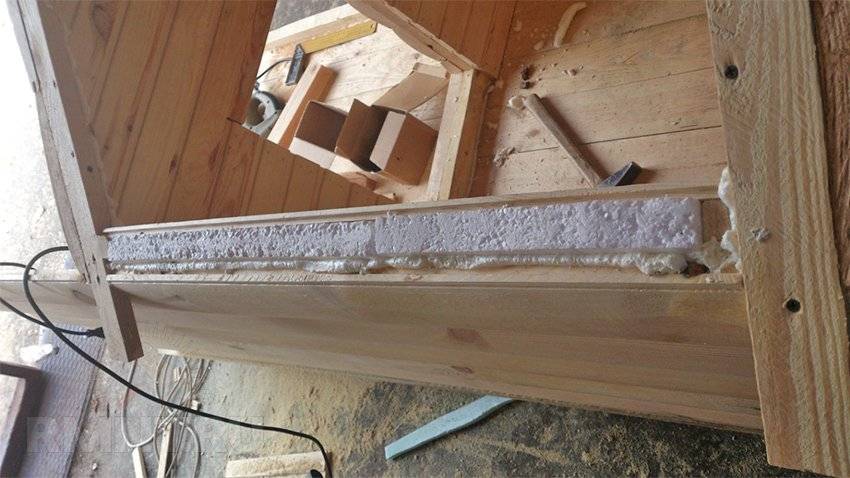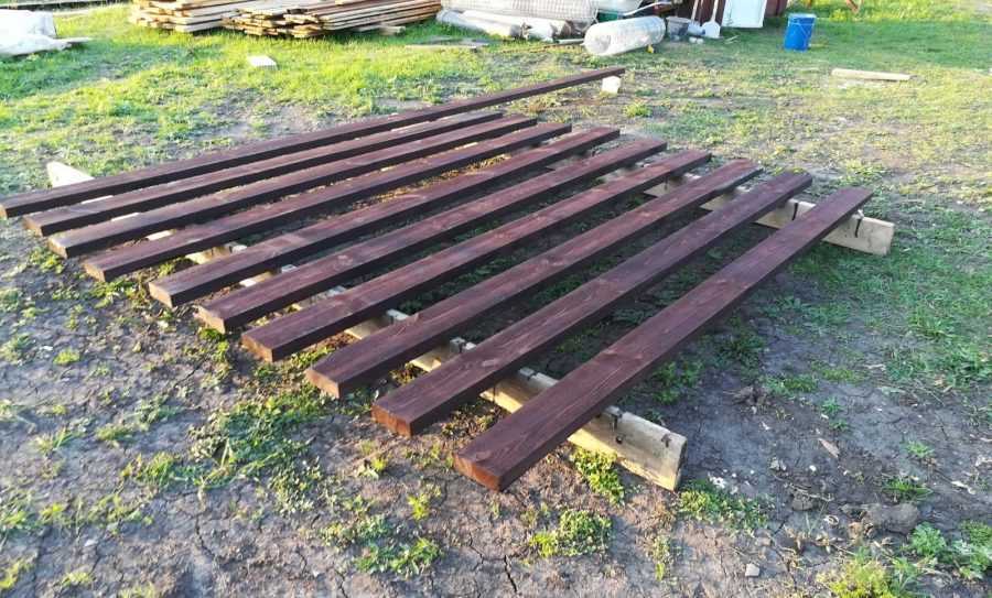 Сверху всё покрывается древесиной. На фундамент первоначально устанавливаются швеллеры, которые свариваются по периметру, чтобы получить прямоугольную форму. На нижнюю полку швеллера располагают обработанную антисептиком доску. Ее следует накрыть рубероидом и сделать просыпку гравием.