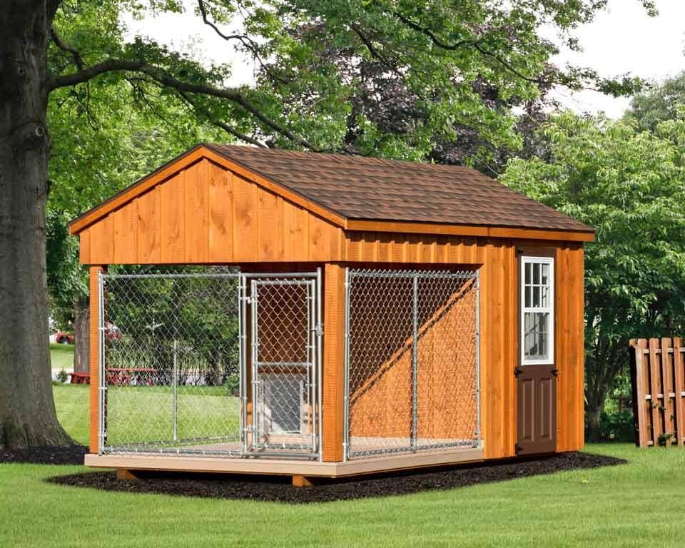 - Закрытые загоны — ограждения для длительного проживания животного. Обязательно имеют крышу, пол (настил), минимум одну глухую стену и будку. Возводятся на участках и утепляются в случае круглогодичного нахождения собаки внутри.