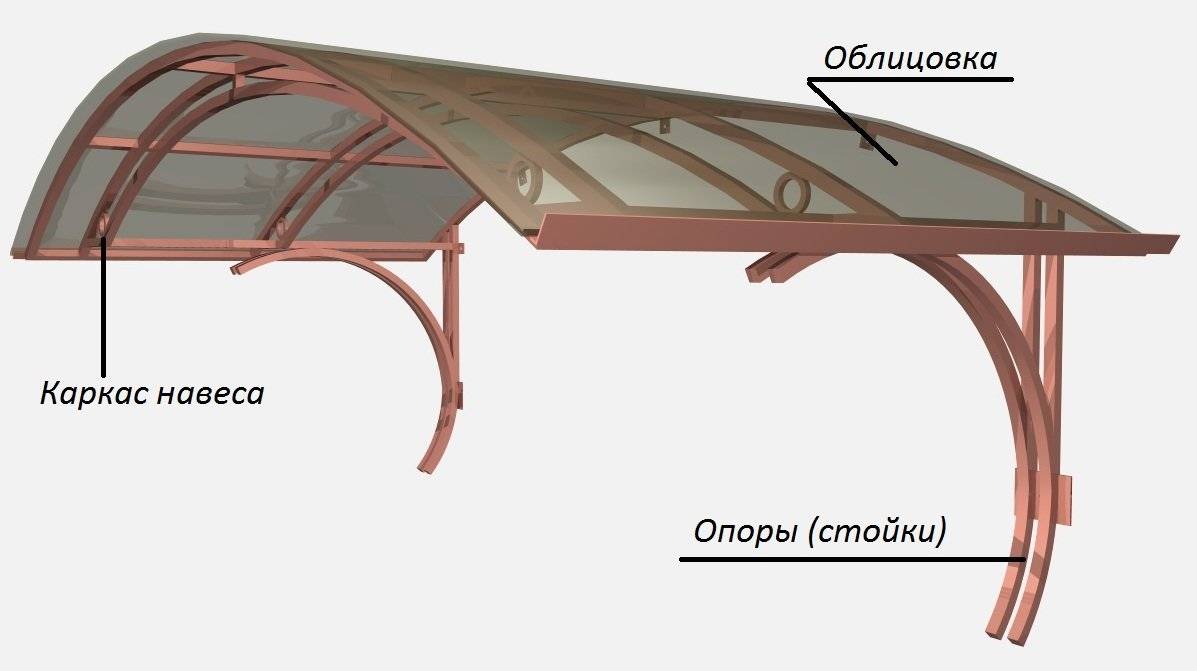 -  каркас – является несущим элементом, на который укладывается кровельное покрытие. Определяет угол наклона козырька. Основным требованием является надежность, ведь, кроме собственного веса, каркас для навеса должен выдерживать слой снега и порывы ветра. По виду каркаса козырьки бывают: