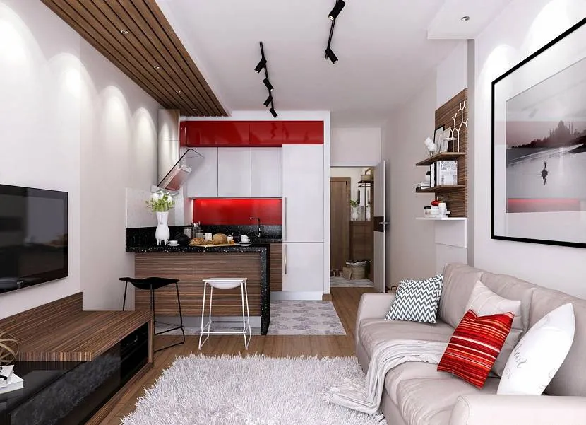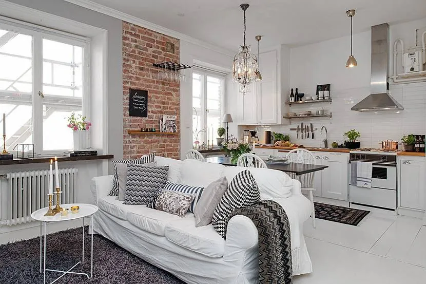 Скандинавский дизайн маленькой кухни-гостиной наполнен светом и воздухом. Он построен на белых цветах и натуральных фактурах (дерево, металл, камень). Всё разбавляется броскими цветами – синим, красным, зеленым, желтым. Но их должно быть в меру, чтобы не заглушить белый тон.