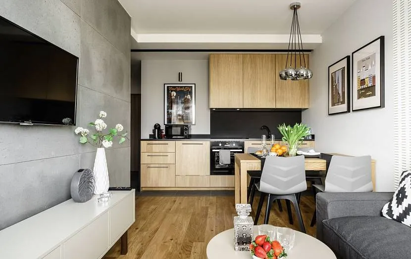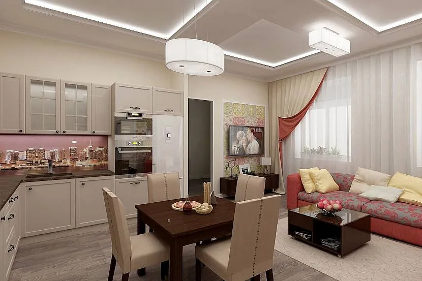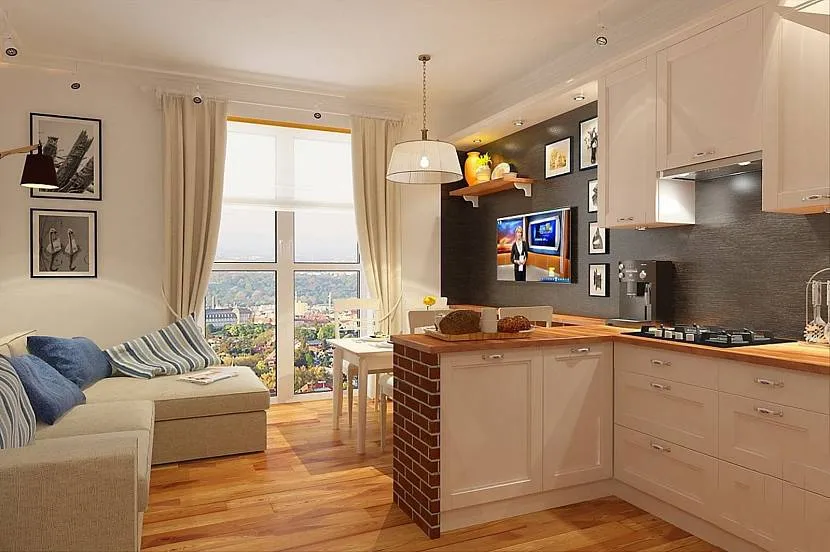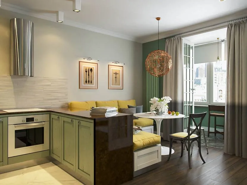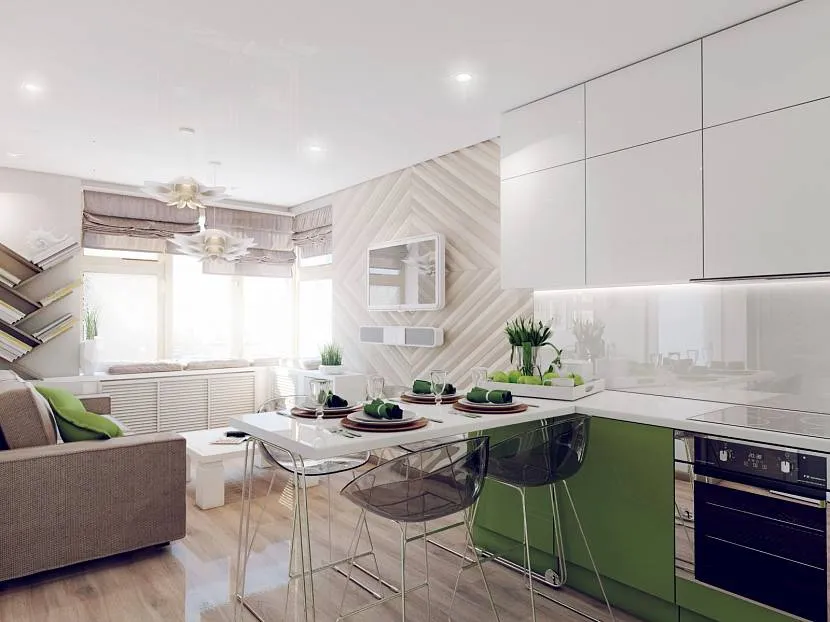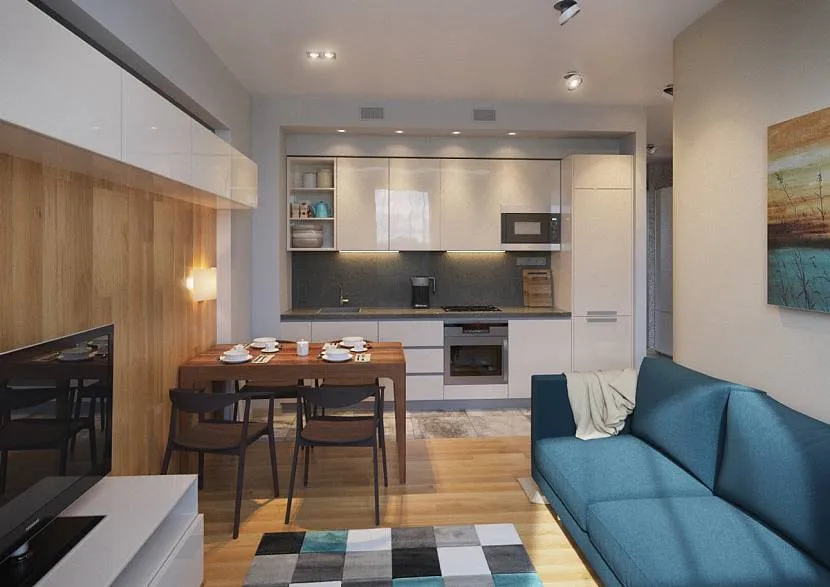 Зонирование маленькой кухни и гостиной с помощью обеденной зоны