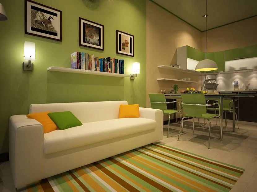 Отделить область кухни целесообразно и практично при помощи напольной плитки. А зону гостиной с помощью ламината, линолеума или ковролина. Усилить оптический эффект и придать интерьеру уюта поможет ковер на полу.