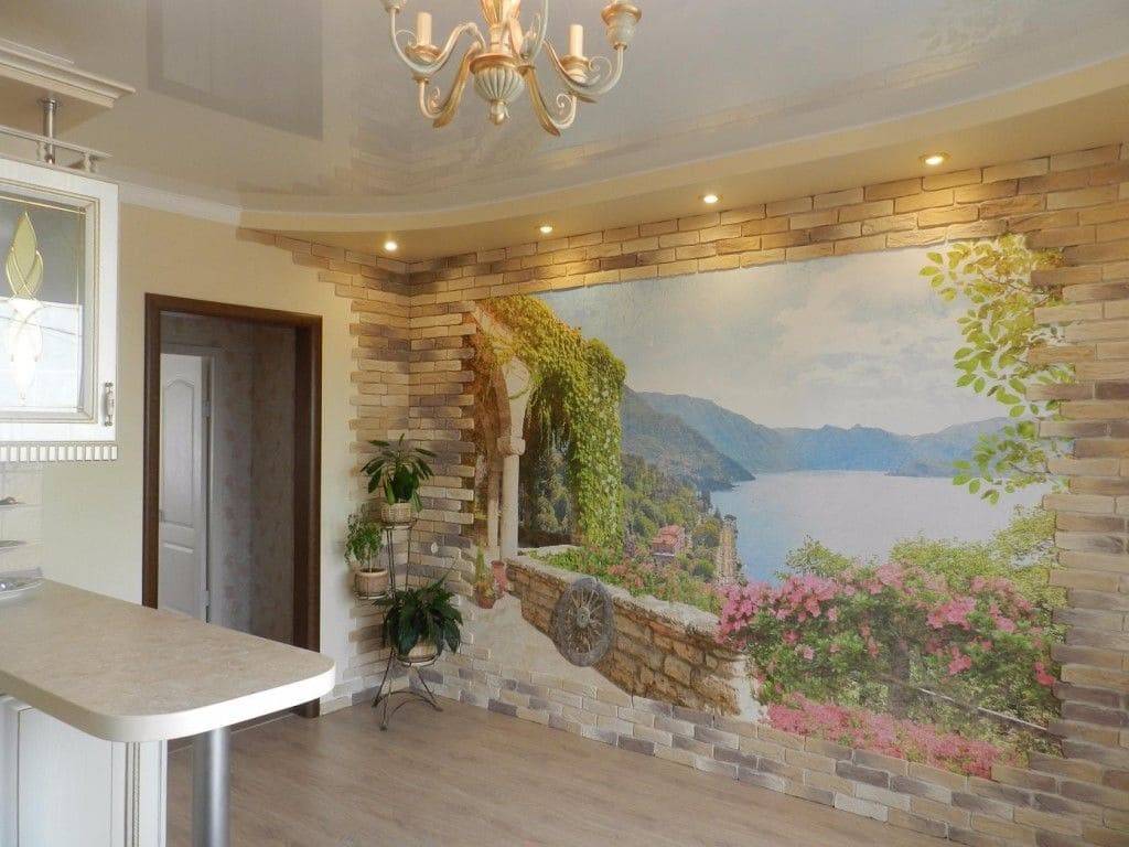- для украшения различных архитектурных деталей, например, ниш, выступов, колонн. При правильном подборе изображения можно добиться невероятных эффектов. Например, при изображении в нише распахнутых дверей балкона с видом на море можно создать ощущение, что квартира, в самом деле, расположена на берегу.