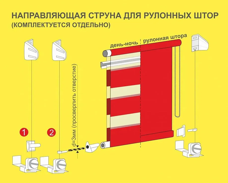 Перед установкой штору необходимо собрать. Для этого поочередно продеваем края лески через отверстия в монтажных уголках и завязываем их двойным узлом. Далее разрезаем леску пополам. В края вала вставляем пластиковые капсулы, после чего защелкиваем ее края в крепежных уголках.