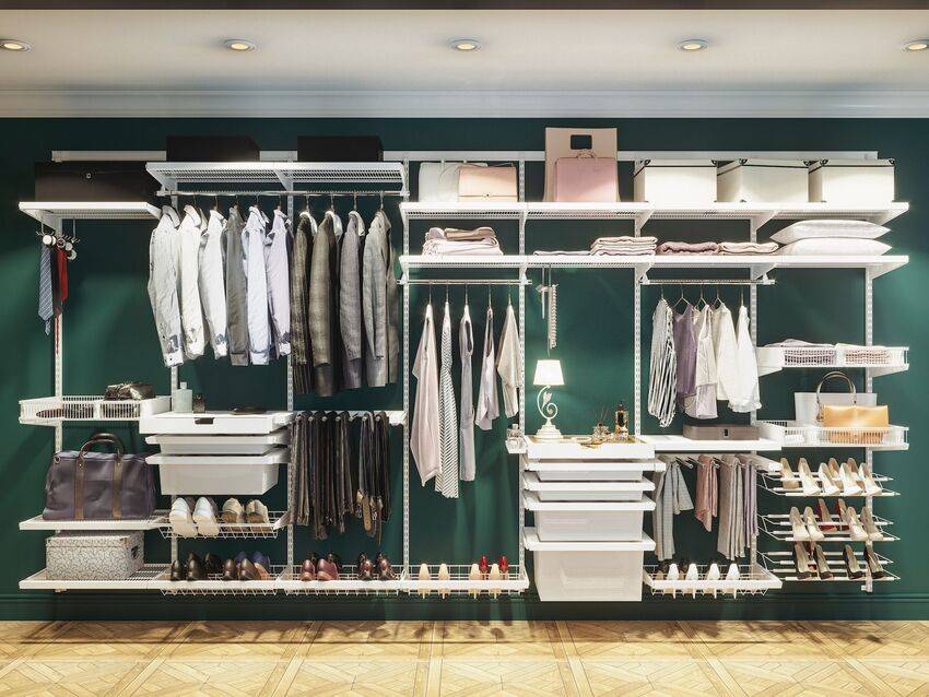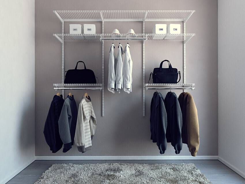 Каркас и полки стеллажей выбирают под цвет стены, чтобы вся конструкция сливалась. Планировка – свободная, мобильная, что делает маленькие гардеробные комнаты в кладовках вместительными.