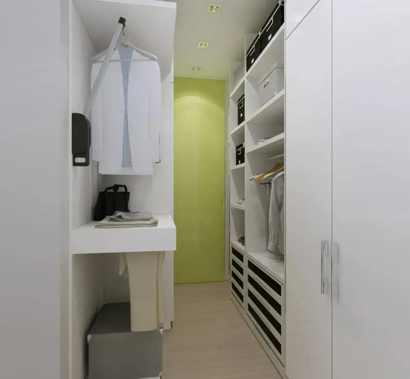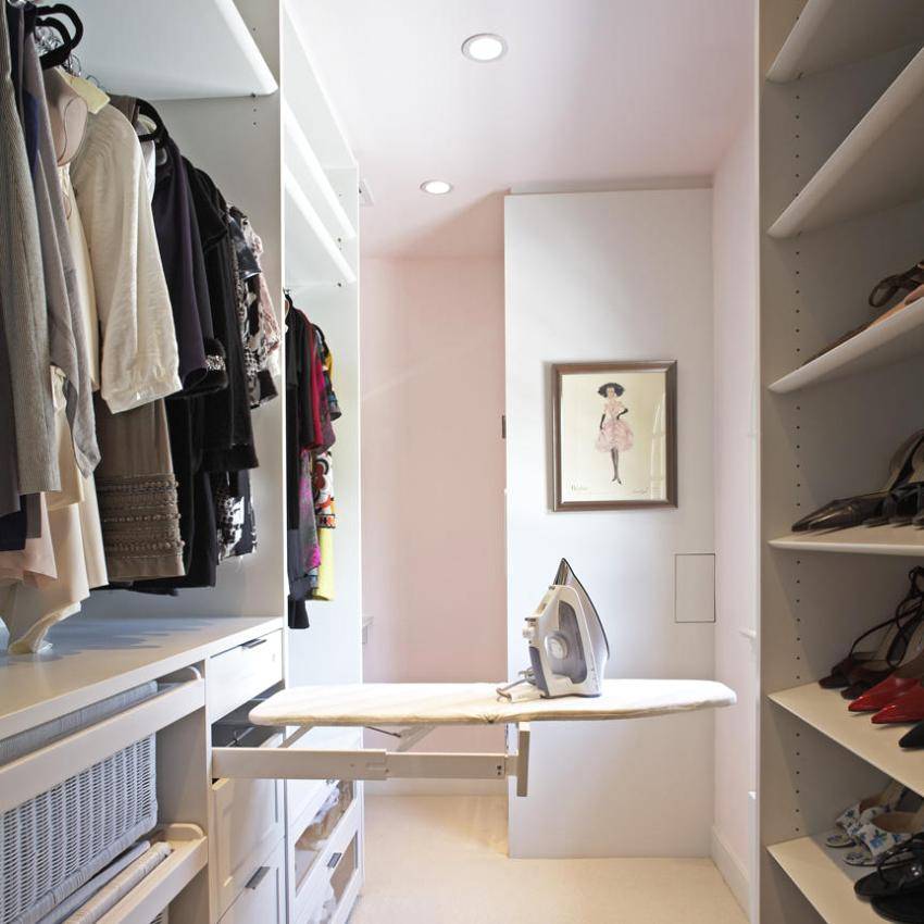 - здесь можно разместить туалетный столик с мягким пуфом, гладильную доску и даже стремянку для удобного доступа к предметам, расположенным на верхних полках;