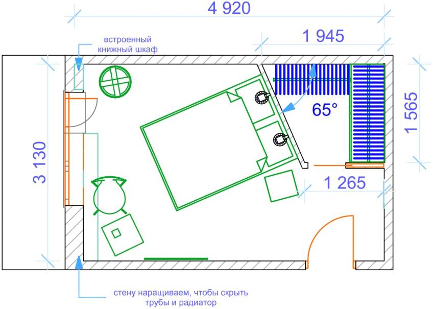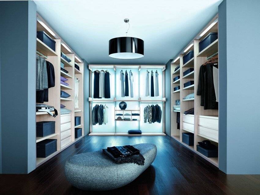 Dressing room может быть самостоятельной единицей или занимать часть жилой комнаты. Варианты размещения: