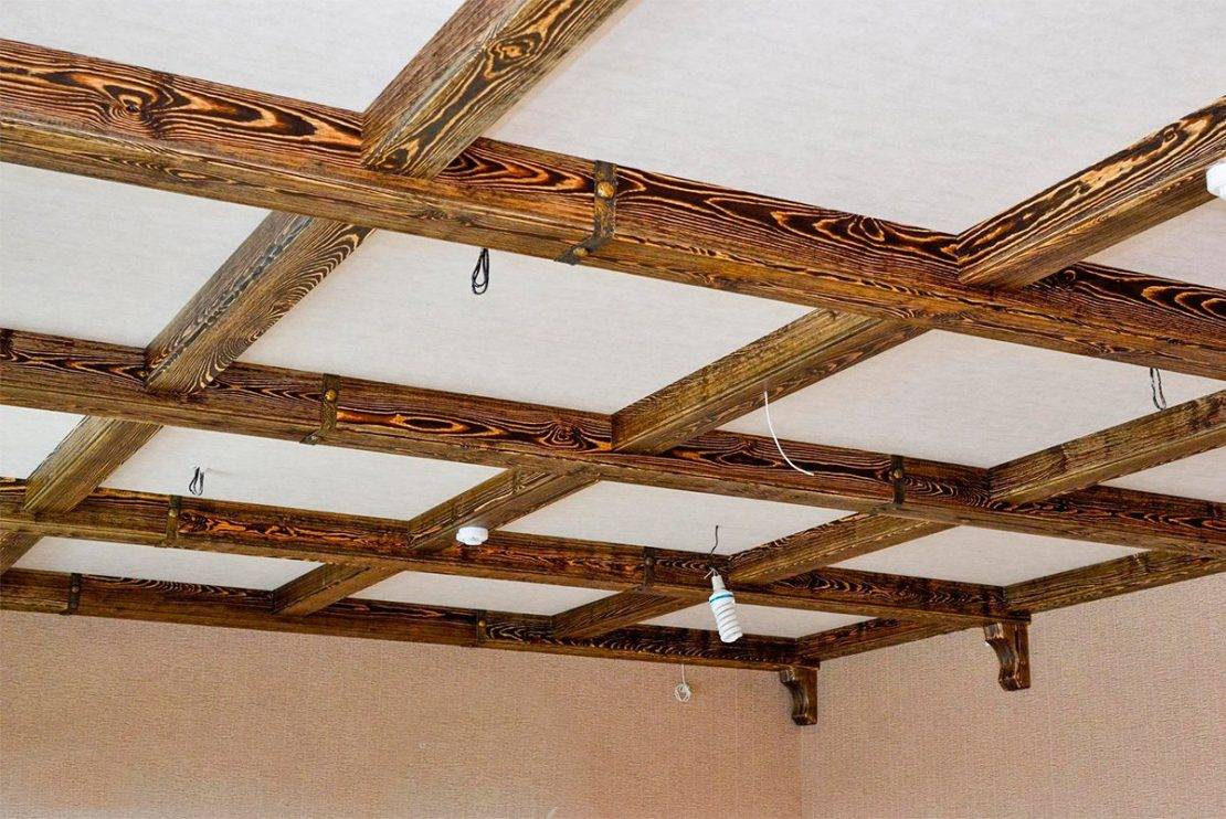 В результате получится конструкция с кессонами и перекрестными фальшбалками на потолке. При этом потолок выглядит практически деревянным. В потолки кессонные можно встроить люстру или точечные светильники.