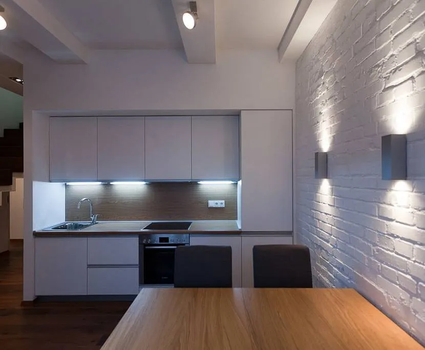 Кирпичная стена в интерьере кухни может выглядеть выигрышно, нужно только подобрать место с хорошим освещением. Если декоративный элемент находится вдали от окон, тогда используют искусственную подсветку. Дополнительные светильники по периметру участка раскрывают красоту отделки.